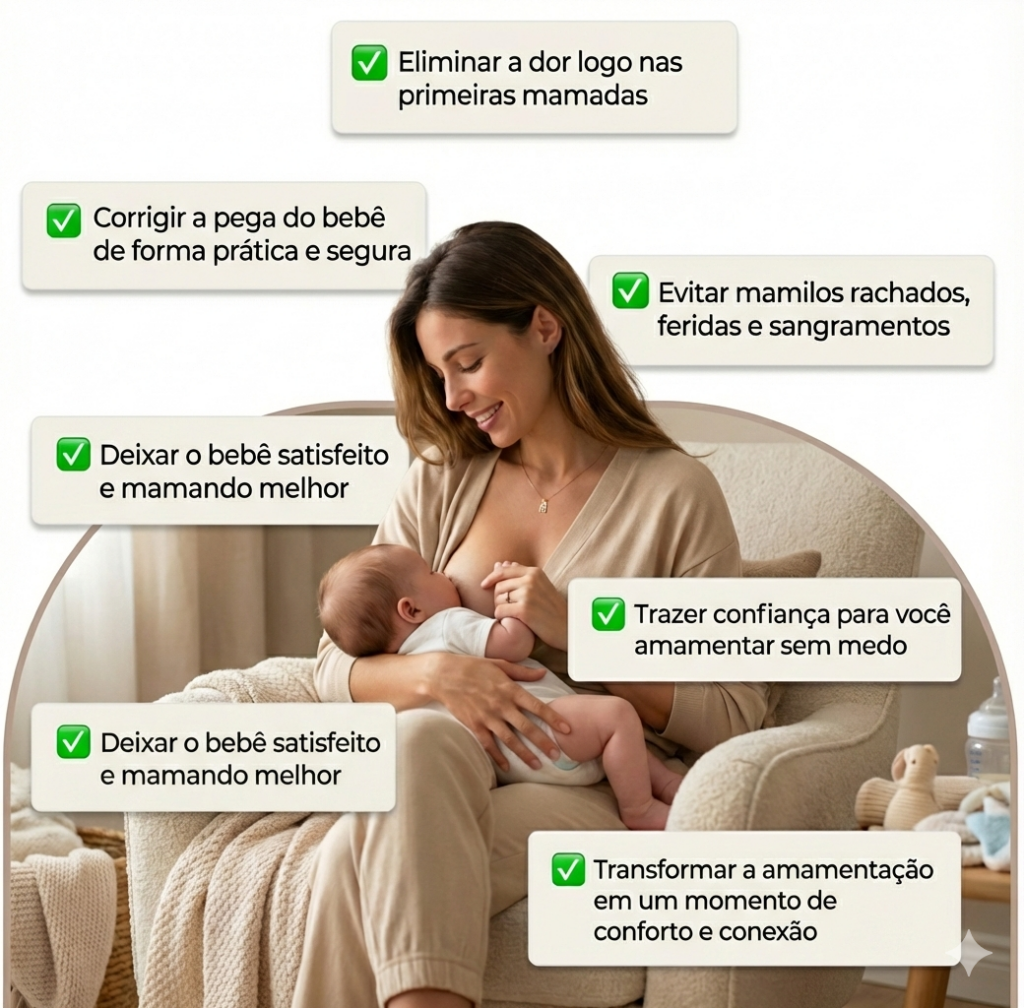 Sim. O conteúdo foi criado justamente para mães que sentem dor, desconforto, têm mamilos machucados ou medo das mamadas. Ele ensina os fundamentos corretos da amamentação para eliminar a dor causada por erros comuns, especialmente na pega do bebê.